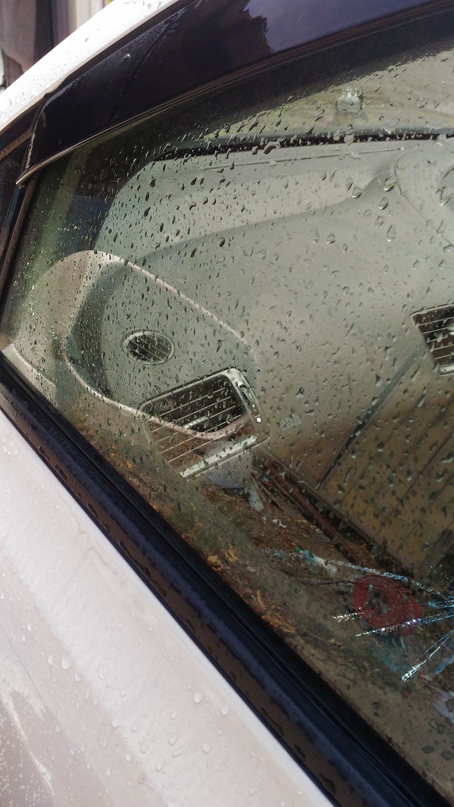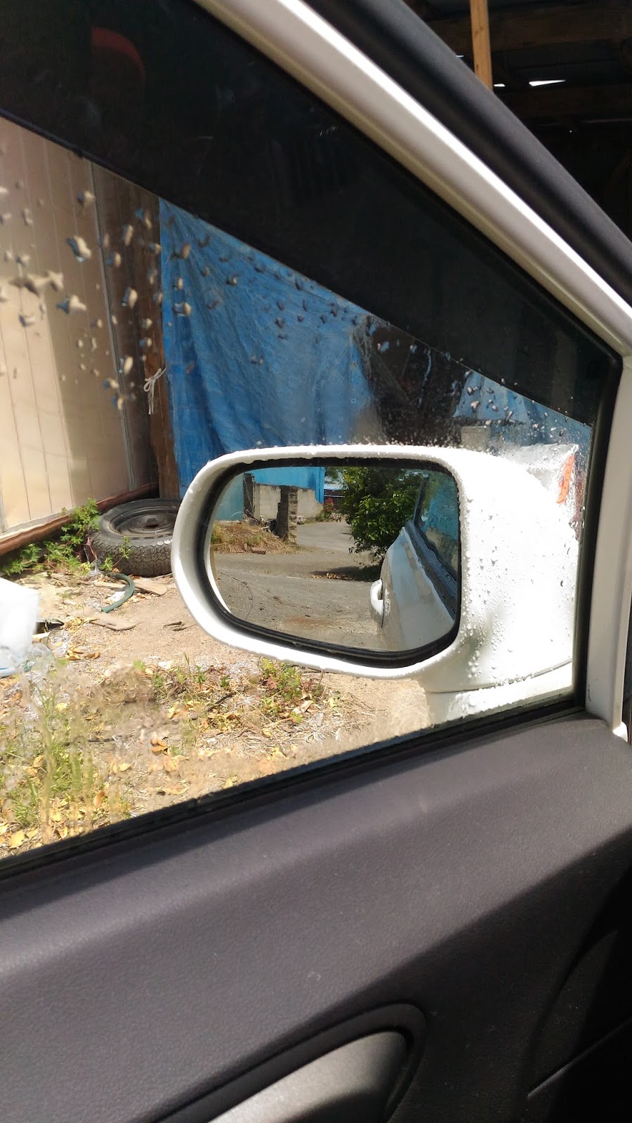 サイドミラーに水滴が残っているように見えますが未施工のサイドガラス部分がミラーに映っているんです(笑)