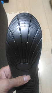 履いてみると靴底がブニブニしています。吸収は第一印象では良さそう。しかし1cmほどの厚みがあるため最初は靴がキツいです。