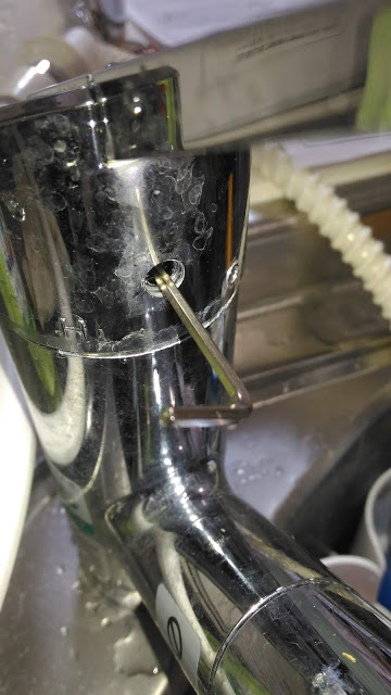 中に水栓付属の2.5mm六角レンチを差し込みナットを緩めると水栓レバーが外れます。