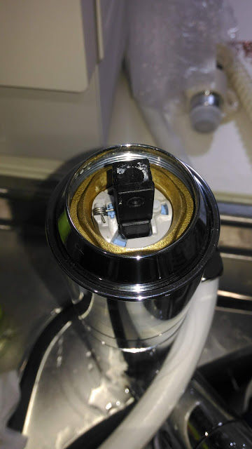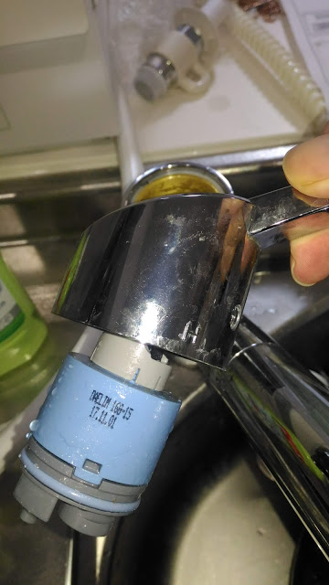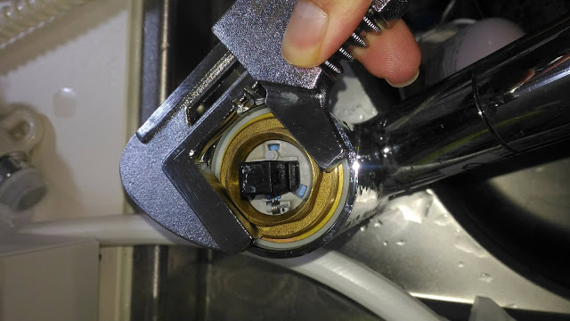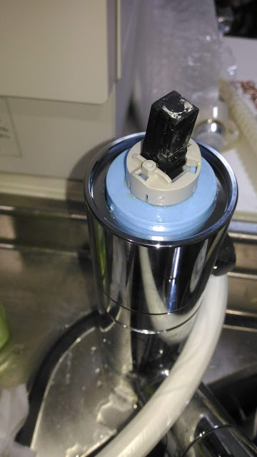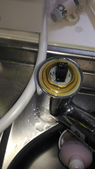 セラミックバルブを外します。指で引き抜くのは難しかったのでこの状態で一旦水栓レバーを六角レンチで取り付けて上に引っ張ったら引き抜けました。