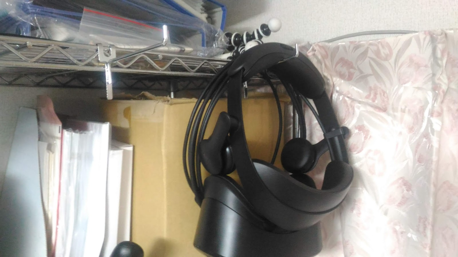 なかなか収納しにくい形のWindowsMRのHMD、Samsung Odysseyですが、フックに引っ掛ければ簡単収納です。隣のフックにはWindowsMRコントローラも2個引っ掛けられます。