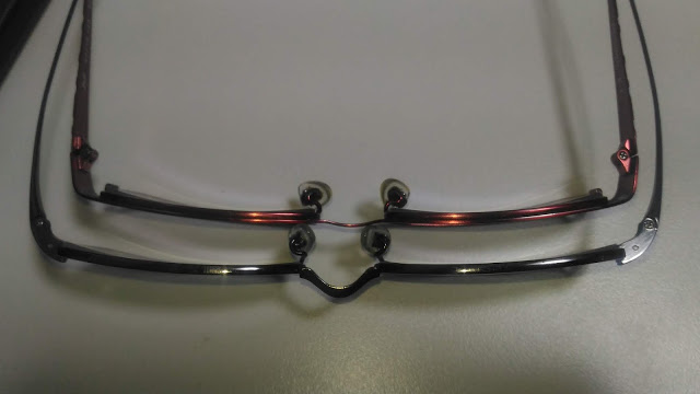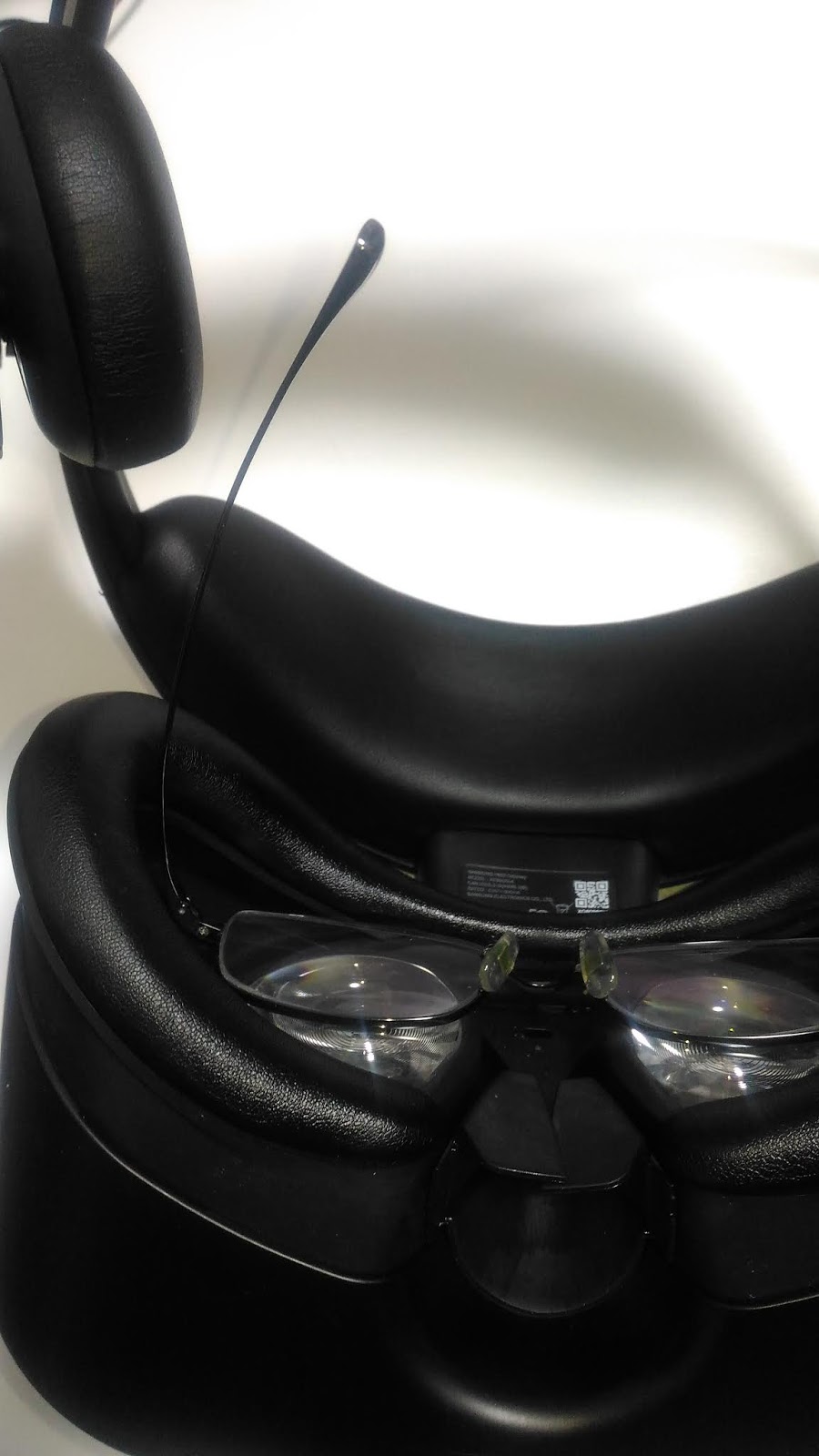 メガネとOdysseyのクリアランスを確認すると、装着した時点でメガネのレンズとOdysseyのレンズが当たっており、ネジを占めると鼻パッドが鼻に押し付けられて痛いということがやっとわかりました。そしてメガネのレンズ部分の幅よりフレームの幅が広がっているデザインのメガネなのでフレームがOdysseyに押されて頭に押し付けられて頭の横が少し痛いことにも気が付きました。