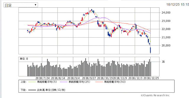 さて2018/12/25クリスマスの相場、日経平均終値は19,155.74円。