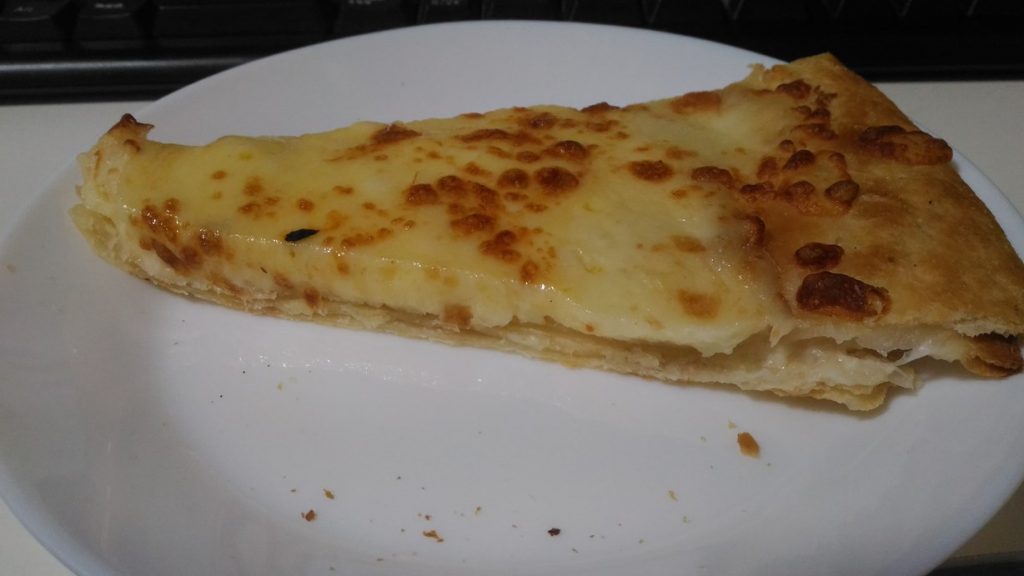 1ピースを取り出してみました。中央部分は確かにチーズがたっぷり乗っていて生地+チーズで1cm以上ありますが端の方は少し残念な感じ。