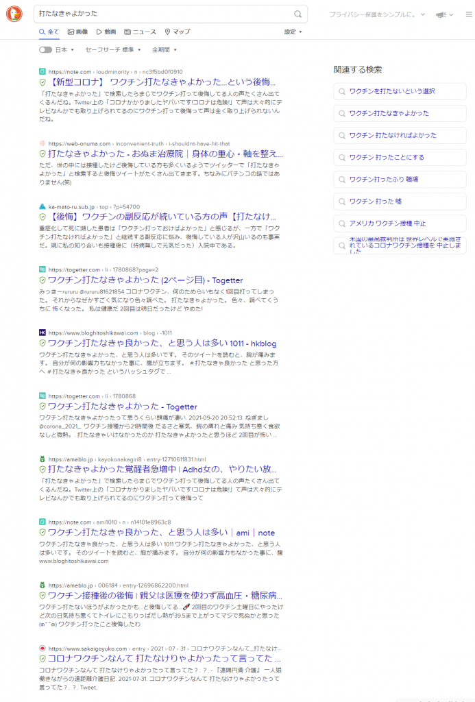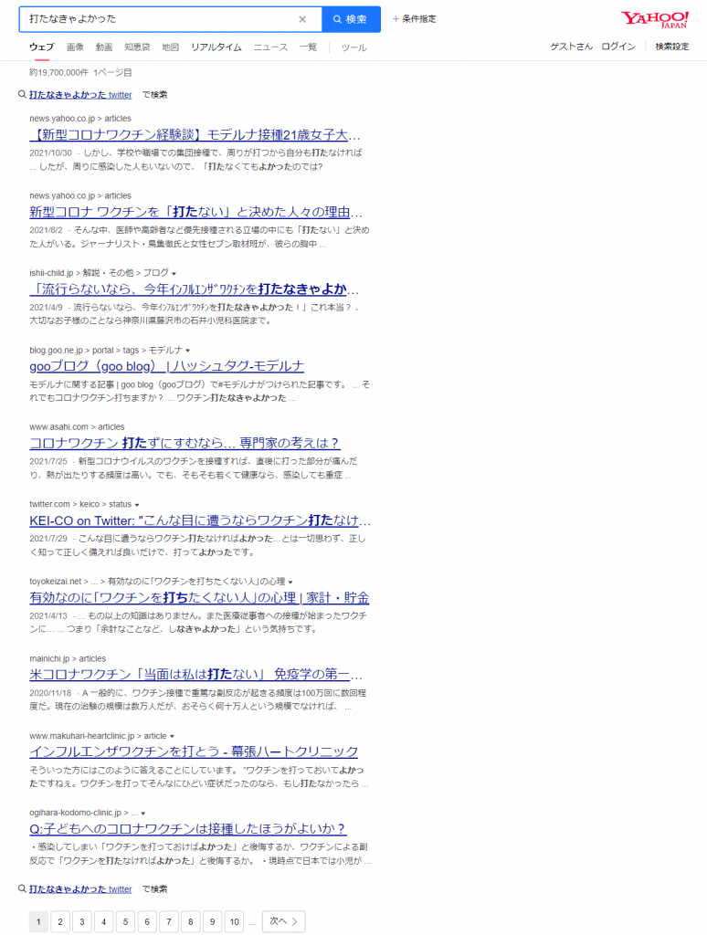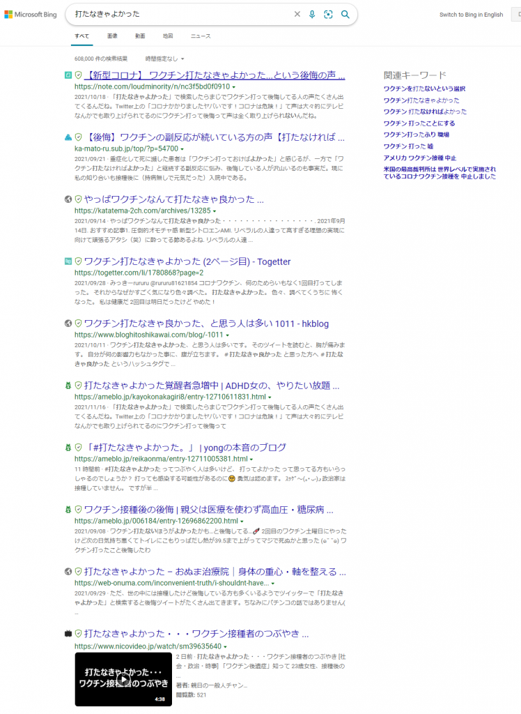DuckDuckGoと同じような結果となっており、やはり「打たなきゃよかった」「後悔」というワードが並んでおり、後悔している人が多いことを想像させます。