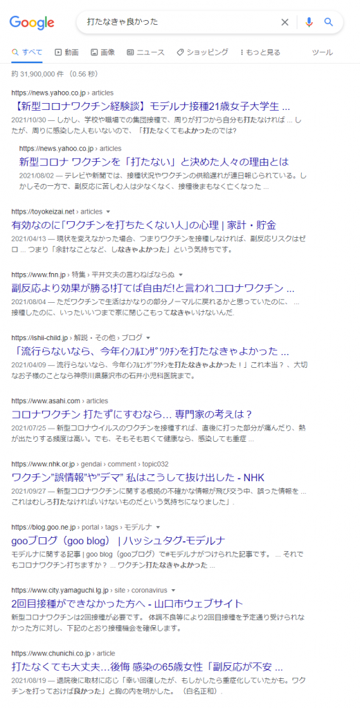 コロナワクチンの経験談とか、打たない理由とか、打ちたくない人の心理とか、出てきますが、「打ってしまって後悔している」ニュアンスの検索結果が見当たりません。