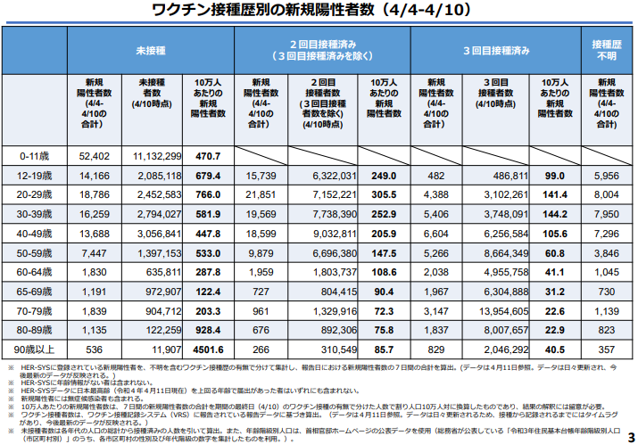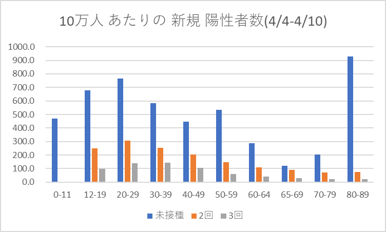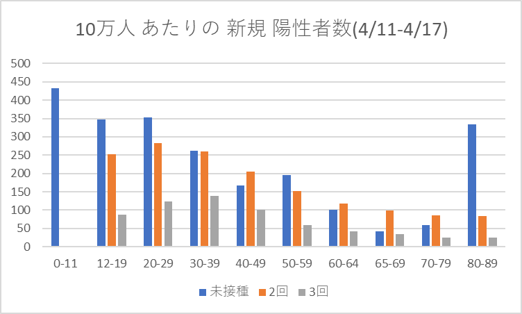4/4週のデータを見て頂くとわかるように 2回3回接種済みの人より未接種の人が10万人あたりの陽性者数が多くなっており、未接種だと感染しやすいということが現れたグラフになっています。