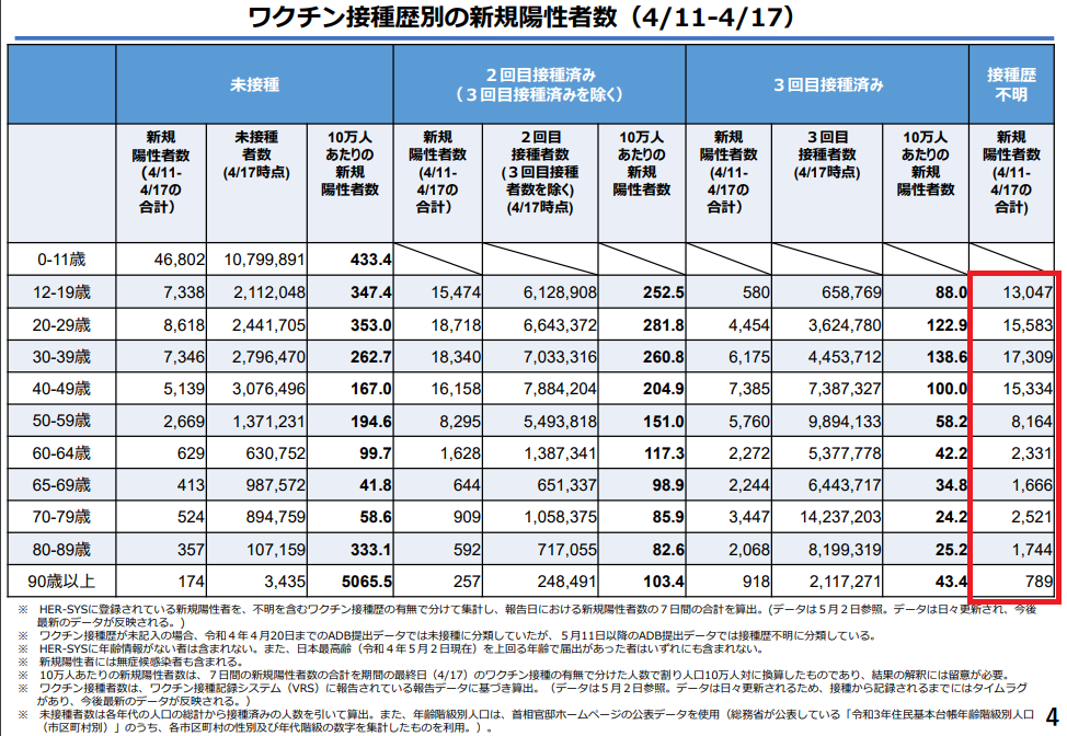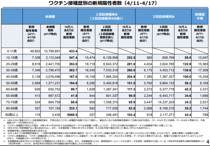 新型コロナで陽性になった人の中で未接種の人、2回接種済みの人、3回接種済みの人を集計したデータになります。これは4/4~4/10のデータと4/11~4/17分のデータになります。