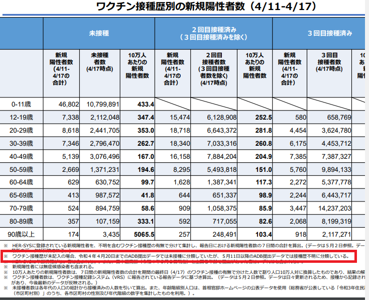 4/4週のデータまではワクチン2回受けたけど日付までは覚えていないので接種歴が記入されなかった場合、未接種に分類してたって話です。